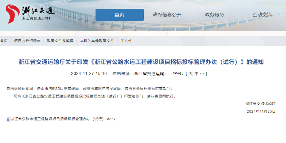 浙江省交通運輸廳關(guān)于印發(fā)《浙江省公路水運工程建設(shè)項目招標(biāo)投標(biāo)管理辦法(試行)》的通知 各市交通運輸局,舟山市港航和口岸管理局、臺州市海洋經(jīng)濟發(fā)展局,各市有關(guān)招標(biāo)投標(biāo)監(jiān)管...