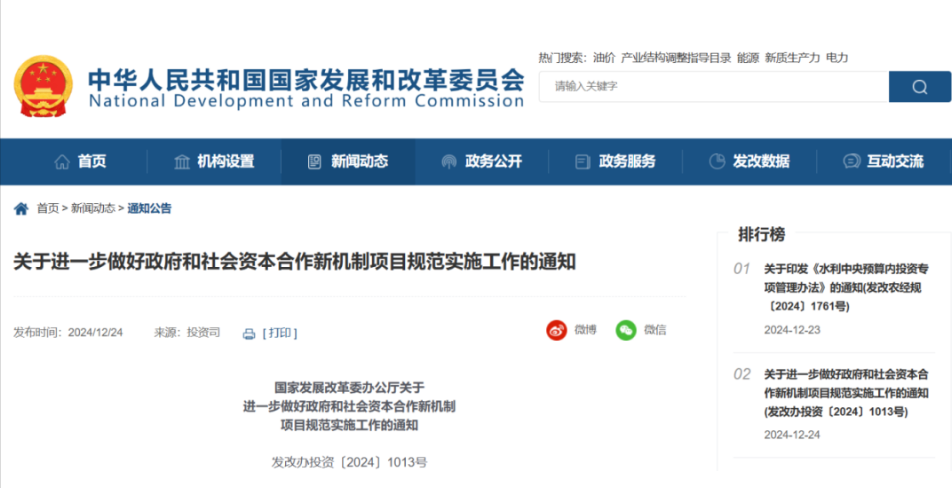 國家發(fā)展改革委辦公廳關(guān)于進一步做好政府和社會資本合作新機制項目規(guī)范實施工作的通知發(fā)改辦投資〔2024〕1013號各省、自治區(qū)、直轄市及計劃單列市、新疆生產(chǎn)建設(shè)兵團發(fā)展改...