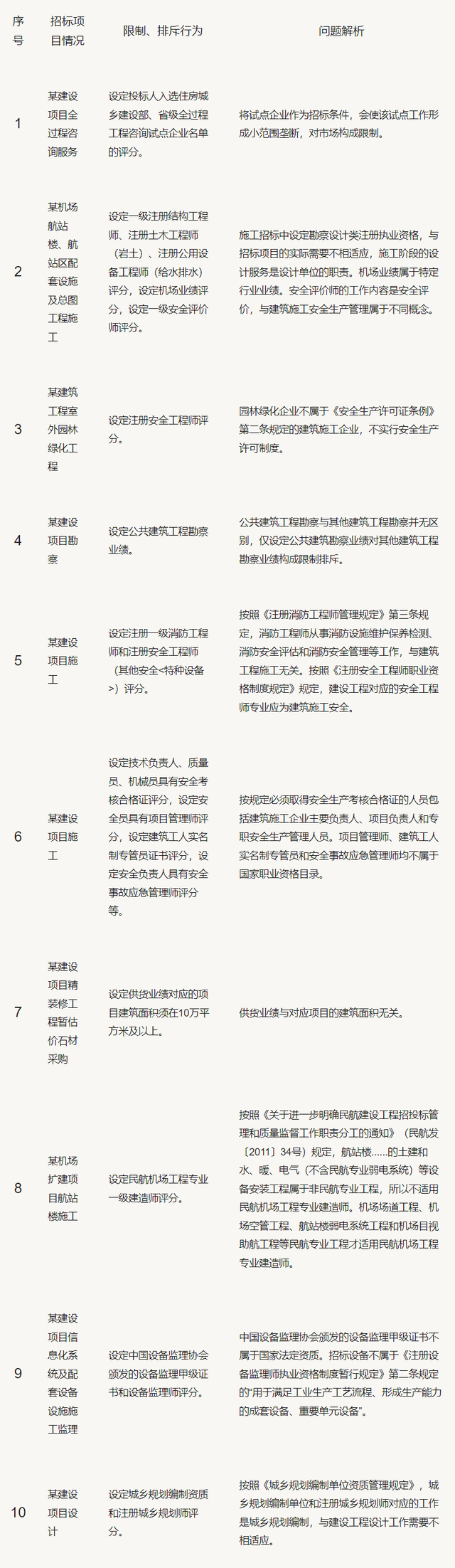為規(guī)范全省房屋建筑和市政工程招標(biāo)投標(biāo)活動(dòng),引導(dǎo)招標(biāo)人、招標(biāo)代理機(jī)構(gòu)規(guī)范編制招標(biāo)文件,四川省住建廳每季度公布一批房屋建筑和市政工程招標(biāo)文件中限制、排斥潛在投標(biāo)人行為典型事例,供招標(biāo)人、招標(biāo)代理機(jī)構(gòu)和監(jiān)督部門對(duì)照檢查,以避免出現(xiàn)類似情形。此次為公布的第一批典型事例。