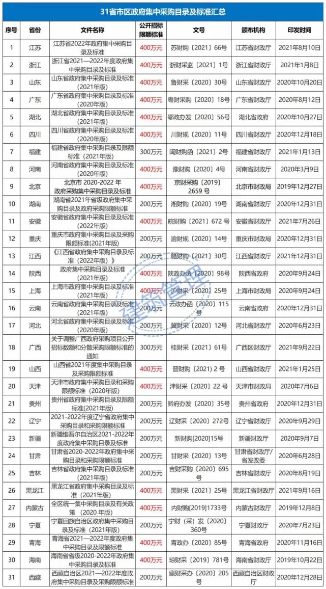 截至目前,已有25省市區(qū)發(fā)布2021年版或2022年版的政府采購集中采購目錄及標(biāo)準(zhǔn),其余6省執(zhí)行的是2020年版本文件。本文為除港澳臺外31個省最新采購政策大盤點!