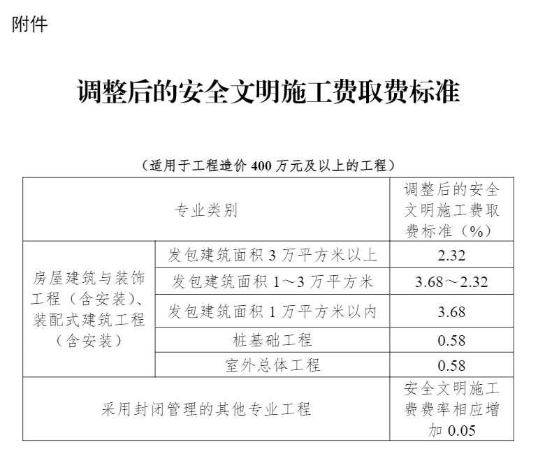 (一)工程造價(jià)400萬(wàn)元及以上的房屋建筑與裝飾工程(含安裝)、裝配式建筑工程(含安裝)以及采用封閉管理的其他工程,其安全文明施工費(fèi)費(fèi)率相應(yīng)增加0.05-0.1%。調(diào)整后的安全文明施工費(fèi)取費(fèi)標(biāo)準(zhǔn)詳見(jiàn)附件。新政 | 住建廳:發(fā)布計(jì)價(jià)依據(jù),400萬(wàn)元及以上工程按本通知實(shí)施!