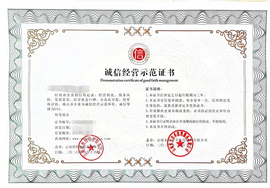 2、誠(chéng)信經(jīng)營(yíng)示范證書(shū)。