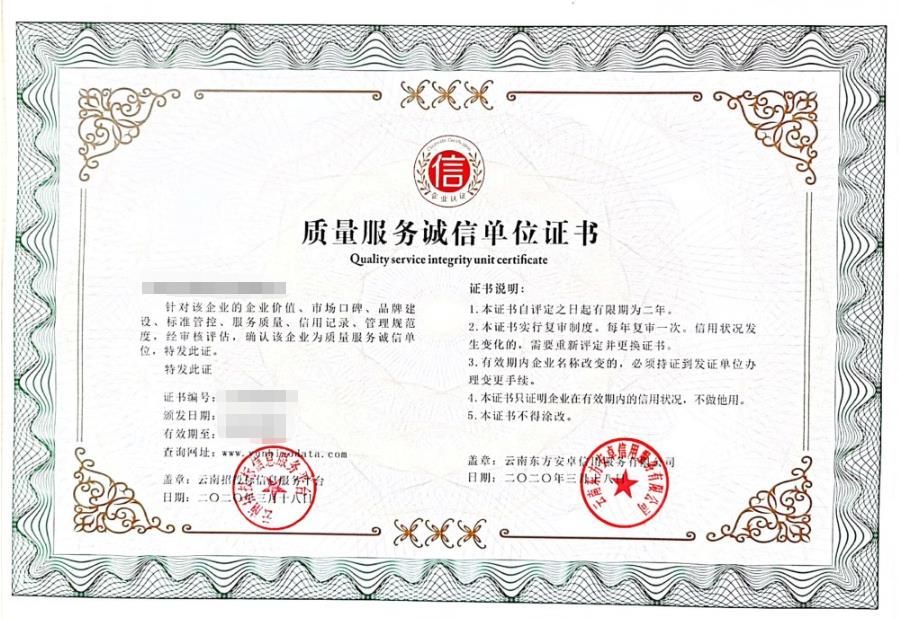 4、質(zhì)量服務(wù)誠(chéng)信單位證書(shū)。