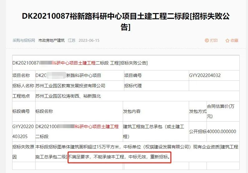招標失敗原因顯示“本標段招標圖單體建筑面積超過15萬平方米,中標單位現(xiàn)有企業(yè)資質(zhì)[建筑工程施工總承包二級]不滿足要求,不能承接本工程,中標無效,重新招標。”